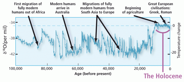 While homo sapiens first appeared some 200,000 years ago, it was only during the Holocene epoch, beginning around 10,000 BCE, that humanity began to flourish. Seasons stabilized, and across those seasons—for nearly 12,000 years—average global surface temperatures never varied, plus or minus, by more than a single degree Celsius. The Holocene provided a climate for agriculture to emerge … followed by cities and civilization.